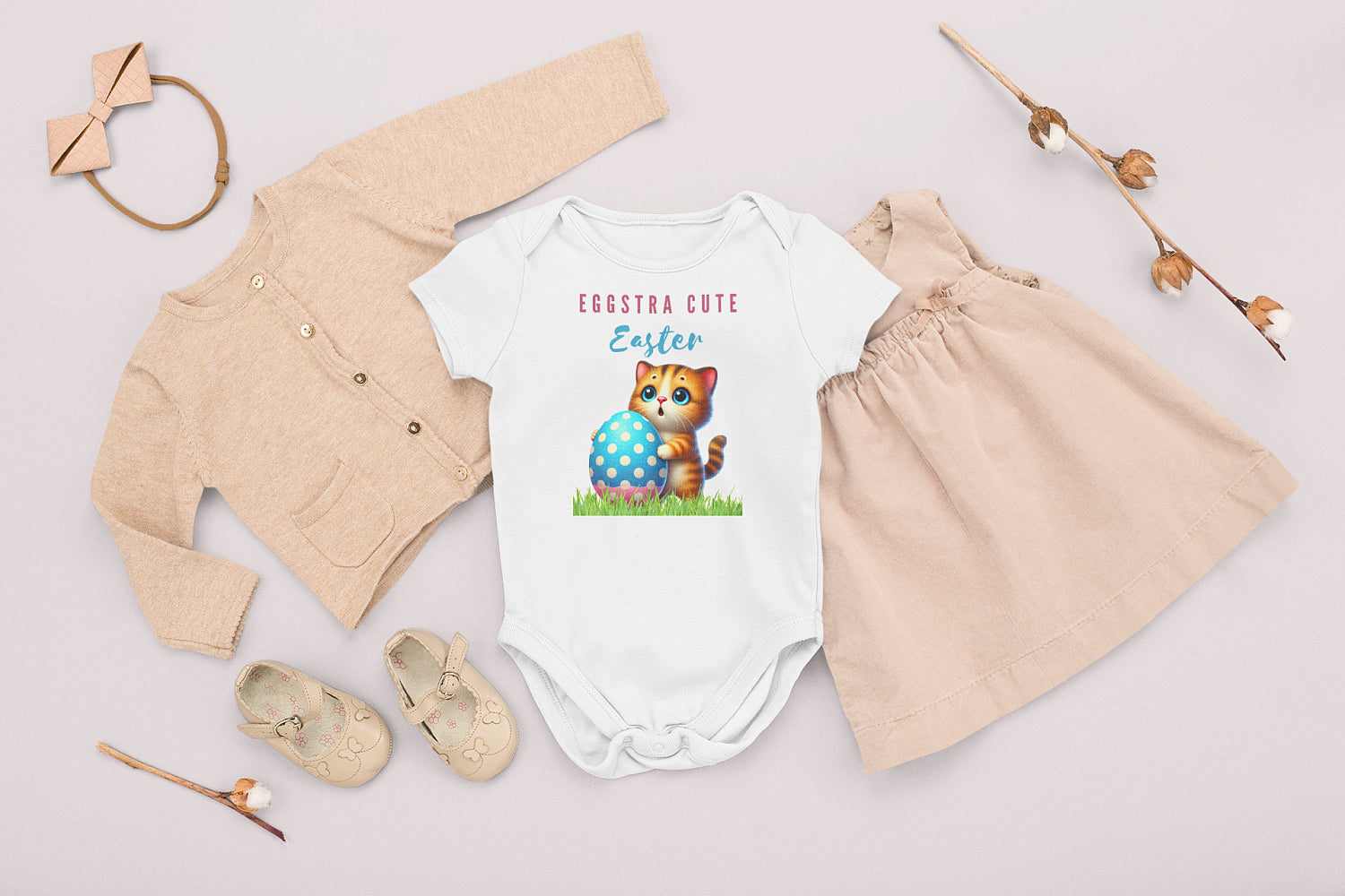 This adorable onesie features a sweet kitten hugging a brightly decorated Easter egg, along with the playful phrase "Egg-stra Cute Easter." It's the perfect outfit for Easter egg hunts, family gatherings, or just capturing those precious holiday memories.